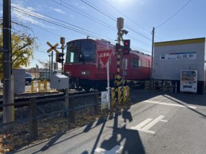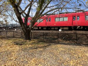 地面には落ち葉が広がり、まるで黄色の絨毯のよう。少し葉が落ちて冬の気配を感じる木々と、鮮やかな赤い電車の組み合わせがとてもフォトジェニックでした。