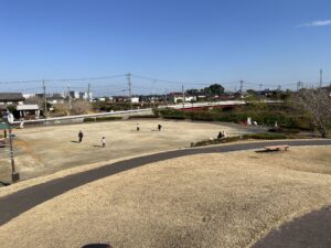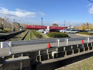 空の青と、名鉄電車の赤 公園に到着してまず感動したのが、このコントラスト! (※ここで赤い電車と木の写真 や 澄み渡るような青空の下、名鉄尾西線の赤い車両が走り抜けていきます。