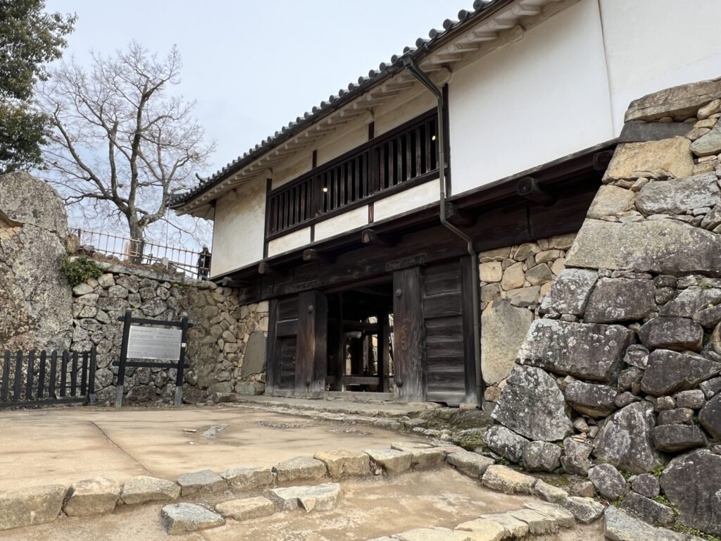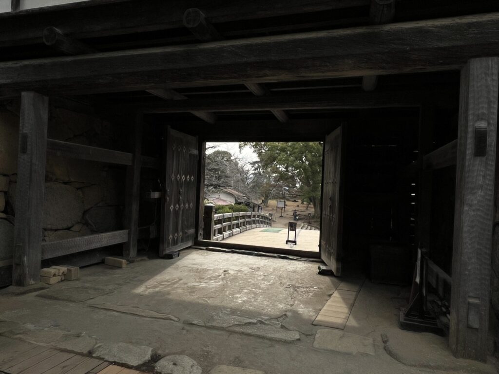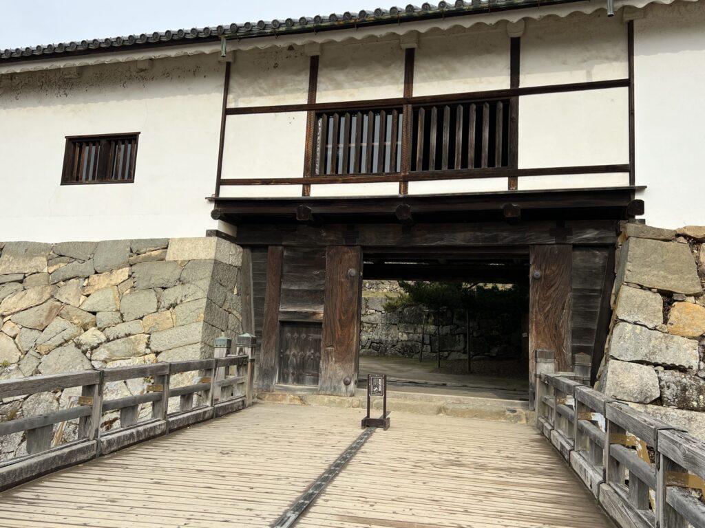 戦(いくさ)への備え「落とし橋」 手前に架かる「廊下橋」は、敵が攻めてきた際に橋を切り落として侵入を阻む役割を持っていました。門の中から外を眺めると、ここが重要な防衛拠点であったことが肌で感じられます。