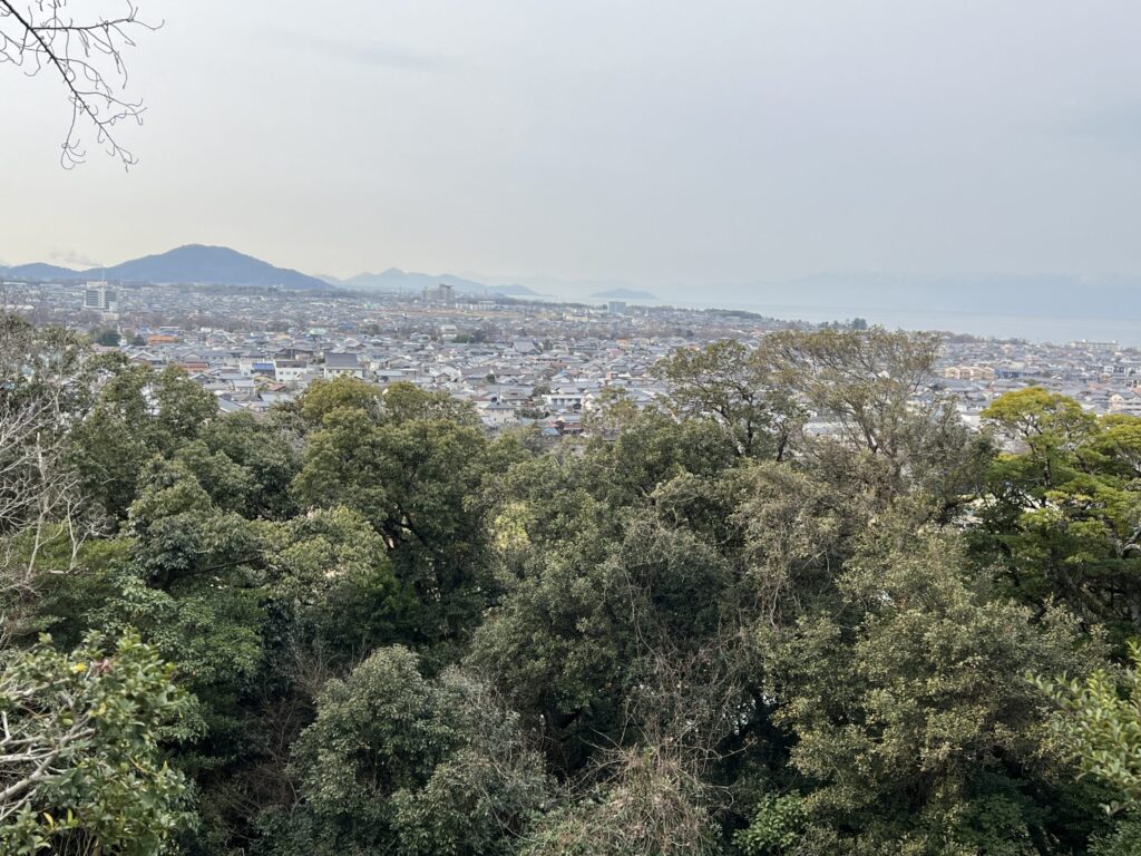 眼下に広がる彦根市街と琵琶湖 手前に広がる豊かな木々の向こうに、彦根の城下町、そして遠くには日本最大の湖である琵琶湖が一望できます。天気が良ければ、対岸の比良山系まで見渡せることもあります。