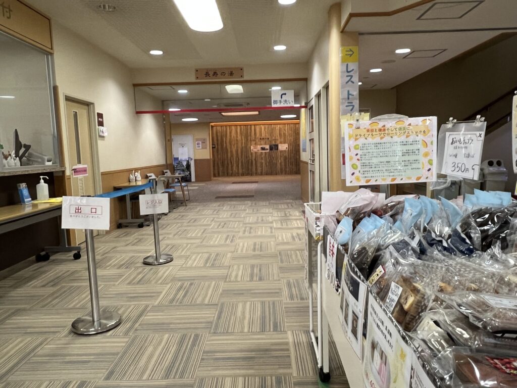 受付を左手に行くと癒しの湯と休憩室やマッサージ等があります。こちらが癒しの湯につづく通路です。先ほどの「長寿の湯」が伝統的な湯治場のような雰囲気なのに対し、こちらの「癒しの湯」は、設備が充実した現代的なリゾート感のある浴場です。