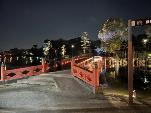 • 光の道: 池にかかる赤い「中之島橋」がライトに照らされ、暗闇の中に鮮やかな紅が浮かび上がります。これが桜のピンク、ツツジの赤、そして夜空のコントラストと相まって、息を呑む美しさです。