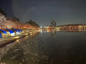 津島天王川公園の夜桜は、昼間の明るく華やかな雰囲気とは一変し、まるで鏡のような水面に光が溶け込む「幻想的な幽玄の世界」が広がります。